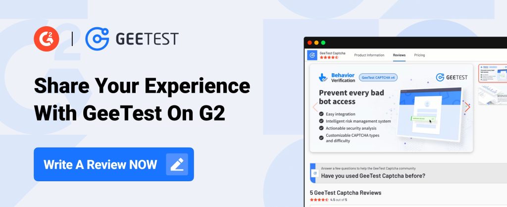 At GeeTest, we value your feedback and continuously strive to improve our solutions to meet your needs. Your insights are incredibly important to us, and we are excited to announce a special initiative to encourage you to share your experience with our bot detection and mitigation software on G2.